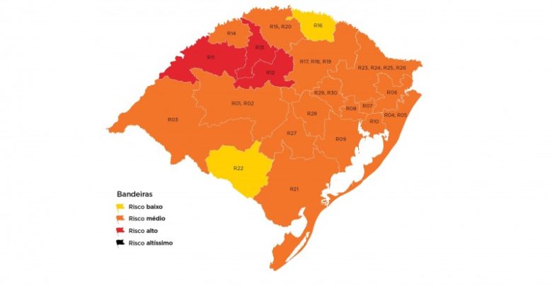 As regiões em bandeira vermelha são Cruz Alta, Ijuí e Santo Ângelo. A região de Cruz Alta não contestou a classificação preliminar em risco epidemiológico alto. As regiões de Ijuí e Santo Ângelo entraram com pedidos de reconsideração, que foram indeferidos depois da análise do Gabinete de Crise.