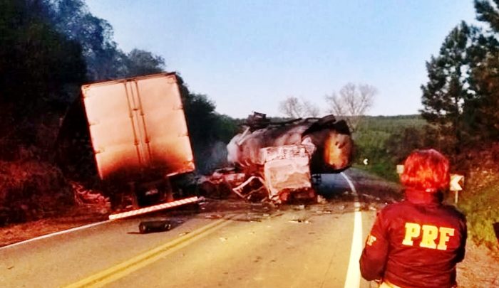 A colisão entre os caminhões provocou uma forte explosão na rodovia. Os bombeiros de São Gabriel, a 48 quilômetros dali, foram acionados para controlar as chamas. Há um bloqueio total na rodovia.