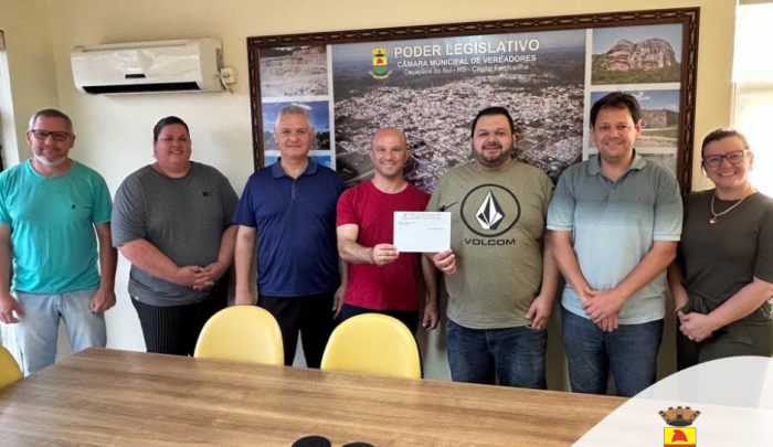Na manhã desta segunda-feira, (27) a Associação Caçapavana de Futsal (ACF), representada pelos seus diretores Diarlen Guterres e Nilberto Barbosa, recebeu uma homenagem da Câmara de Vereadores. A moção, entregue por Mariano Teixeira (PP), Mirella Biacchi (PDT), Marquinho Viviam (MDB), Silvio Tolfo Tondo (PP) e Patricia Castro (PL), reconheceu o brilhante desempenho da equipe no recente campeonato estadual de futsal, série C, em nome do Legislativo Caçapavano.