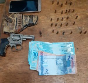 O autor, o qual possui antecedentes criminais por: roubo a residência com lesões, perturbação da tranquilidade, lesão corporal 5x, ameaça 5x, vias de fato, roubo com lesões, cárcere privado e desobediência, recalcitrou a abordagem, sendo necessário o uso moderado da força para contê-lo. Foi apreendido no local um revólver cal.22, argentino da marca Ítalo Gra, além de R$ 1.327,00 reais em moeda corrente e 29 munições cal.22.