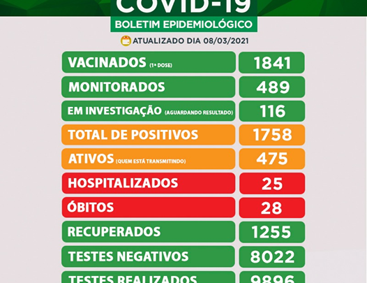 O número de pessoas que se recuperaram do vírus é de 1255, e já são 1841 os vacinados contra a Covid-19.