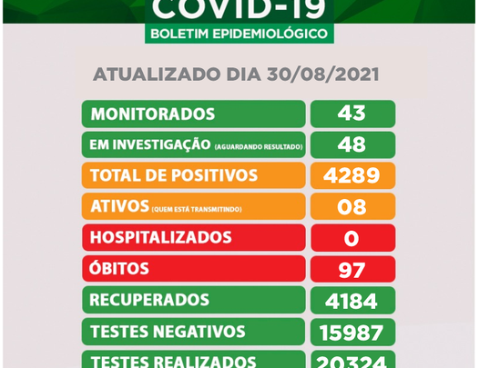 O boletim informa que não há pacientes hospitalizados, por Covid-19 e desde o último informe não foram registrados óbitos ligadas a Covid-19.