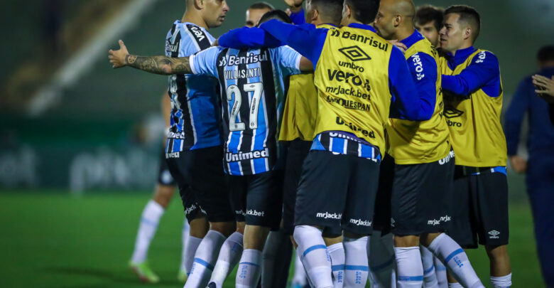 Foi aos 18 minutos, em uma jogada pelo meio, que o Grêmio abriu o marcador: Villasanti trabalhou com Diego Souza e arriscou de fora da área, mandando no canto esquerdo da meta adversária.