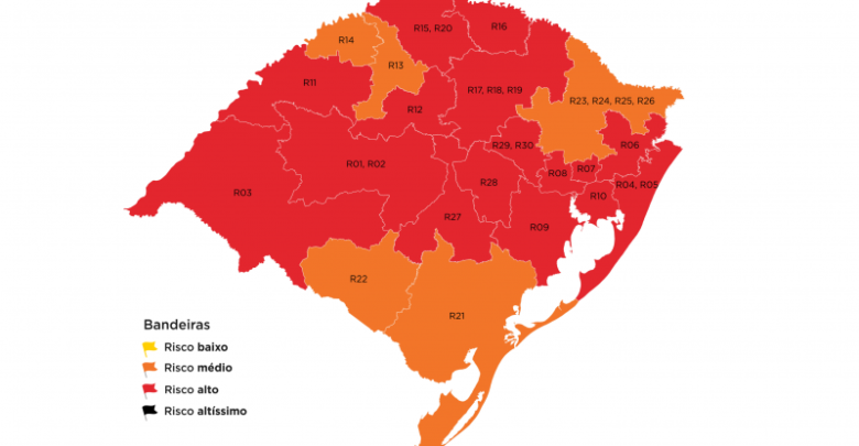 Das 16 regiões classificadas em bandeira vermelha, 14 já aderiram ao sistema de cogestão regional, ou seja, podem adotar protocolos próprios compatíveis até o nível de restrição da bandeira laranja. Guaíba e Santa Maria, que não aderiram à cogestão, devem seguir os protocolos de bandeira vermelha determinados pelo Estado. As duas são as únicas das 21 regiões Covid que não aderiram ao sistema de cogestão regional.