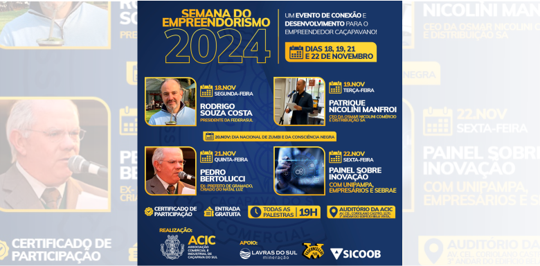 “Um dos pontos altos desse ano, sem dúvidas, será a palestra de quinta-feira, dia 21, quando vamos receber o ex-prefeito de Gramado, Pedro Bertolucci. Ele foi o criador do Natal Luz, que mudou o fluxo turístico da Serra Gaúcha. Sem dúvidas, o relato poderá servir de inspiração para os empreendedores do município”, afirmou o presidente da ACIC, Eraldo Vasconcelos.