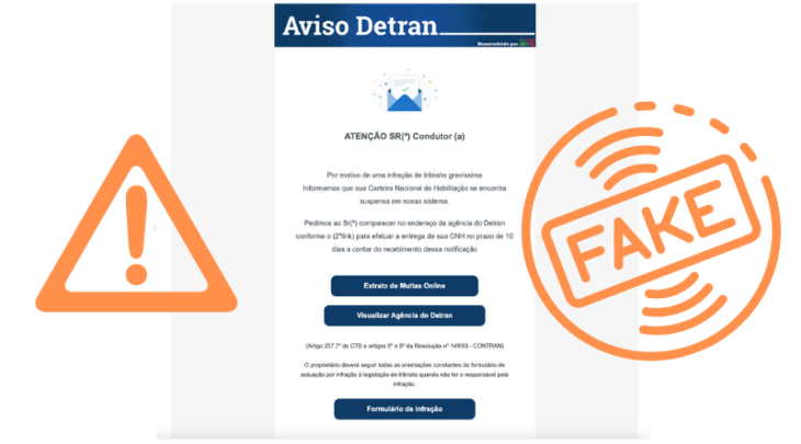 O órgão informa que não envia e-mails de notificação de infrações e penalidades. As comunicações são realizadas aos proprietários de veículos por correios, com aviso de recebimento (AR). Para quem aderiu ao Sistema de Notificação Eletrônica (SNE) do Denatran, as notificações são enviadas exclusivamente via aplicativo Carteira Digital de Trânsito.