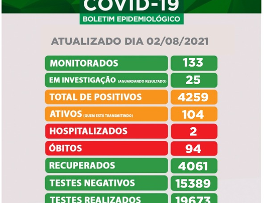 Não foram registrados óbitos desde o último boletim, sendo 94 as mortes ligadas a Covid-19 até a presente data.