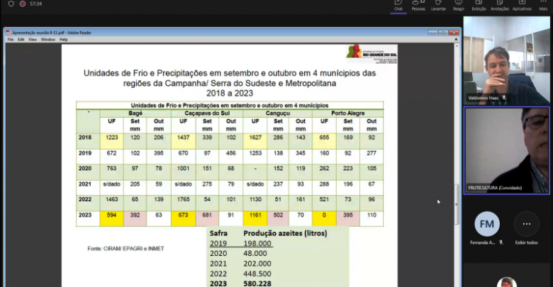 As condições para a próxima safra, as pesquisas conduzidas para a olivicultura no Estado e dados sobre a produção da safra 2023 foram os temas tratados durante a reunião da Câmara Setorial da Olivicultura nesta quarta-feira (08/11). O encontro integrou a programação do 28º Congresso Brasileiro de Fruticultura, que ocorre em Pelotas até sexta-feira (10/11), sendo realizado de forma híbrida pela Secretaria da Agricultura, Pecuária, Produção Sustentável e Irrigação (Seapi).