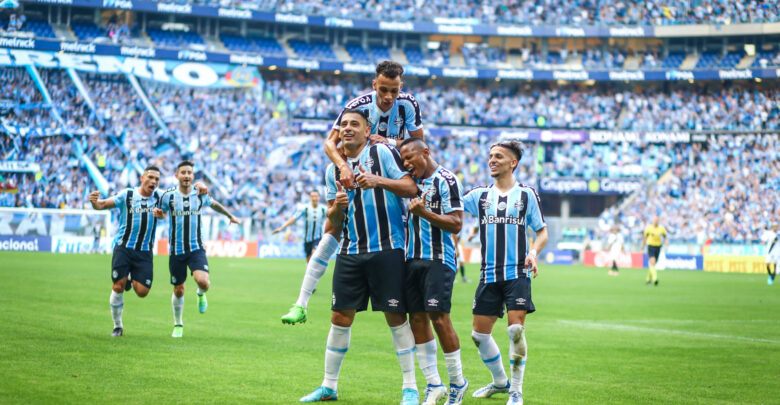Mas o Grêmio que imprimiu maior intensidade e superioridade no primeiro tempo da partida. Com 9 minutos jogados, foi o time de Roger Machado quem fez uma grande jogada e abriu o marcador, para a emoção dos milhares de gremistas na Arena. Diego Souza recebeu um lançamento preciso de Villasanti, dominou no peito de costas para o gol e, de bicicleta, mandou para as redes. A bola ainda tocou no goleiro e morreu no fundo do gol.