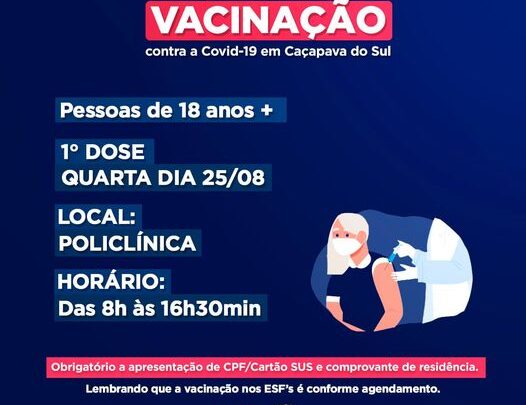 A Secretaria de Saúde de Caçapava do Sul informa que hoje, quarta-feira dia 25 de agosto, tem super vacinação de 1ª dose para pessoas de 18 anos ou mais. O horário de vacinação na Policlínica é a partir das 8h até às 16h30min