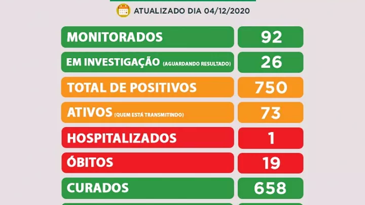 O número de curados também aumentou para 658, 12 a mais em relação ao último boletim e de negativos foram 52 a mais.
