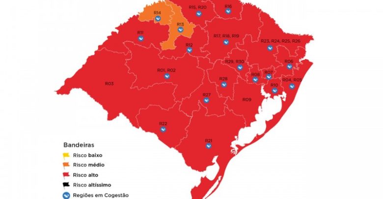 Caso a classificação prévia seja mantida, as 17 regiões em bandeira vermelha que aderiram ao sistema de cogestão regional podem adotar os protocolos próprios compatíveis até o nível de restrição da bandeira laranja. Guaíba e Uruguaiana estão em vermelho e não aderiram à cogestão, portanto, devem seguir os protocolos determinados pelo Estado.