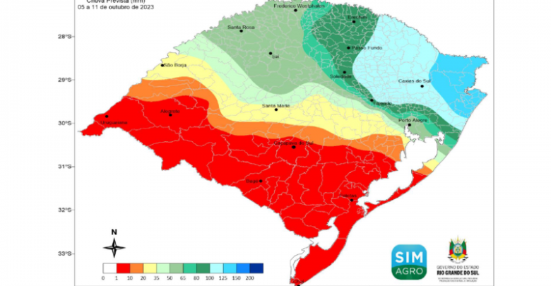 Os volumes esperados deverão ser inferiores a 10 mm na Fronteira Oeste, Campanha e Zona Sul. No restante do Estado, as projeções indicam valores entre 15 e 35 mm, podendo superar 50 mm no Alto Uruguai, Planalto, Campos de Cima da Serra, Serra do Nordeste e Litoral Norte.